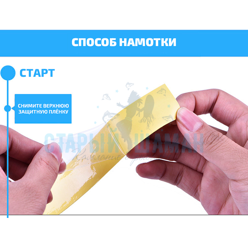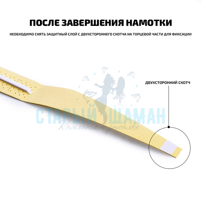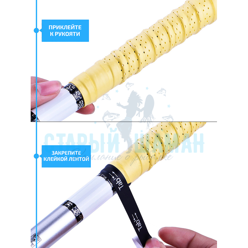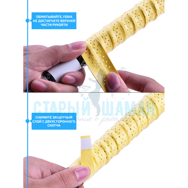 1. Снимите верхнюю защитную плёнку и аккуратно удалите клейкую основу. Начинайте обмотку рукоятки снизу.
