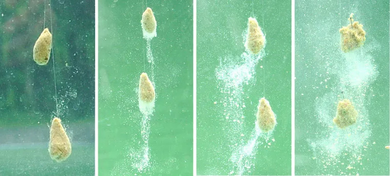 При смешивании с водой аминокислоты, привлекающие карасей вступают в мгновенную химическую реакцию, а приманка начинает разбухать и увеличиваться в размерах.