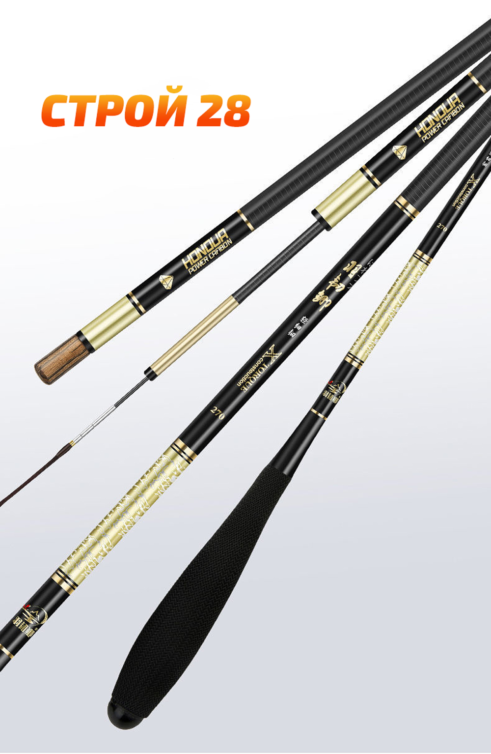 Строй удилища 28, длина 6.3м. Длина в сложенном состоянии 121.5см. 6 колен. Вес без двух пробок 165г(±5), вес задней пробки 10г. Толщина основания 17мм. Толщина основания хлыста 3,2мм