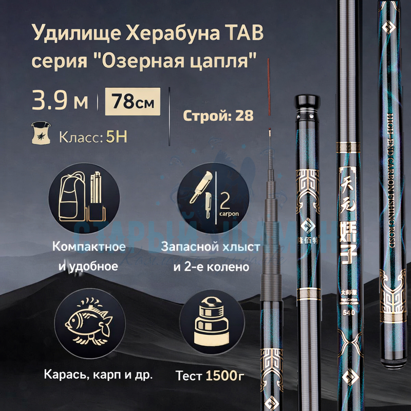 Характеристики : Удилище Херабуна TAB серия "Озерная цапля" 3.9м, длина в сложенном 78см (строй 28, 5H) + хлыст и 2-е колено