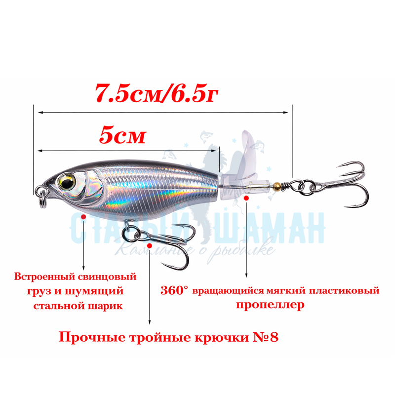 Длина воблера 7,5 см, вес 6,5 грамм